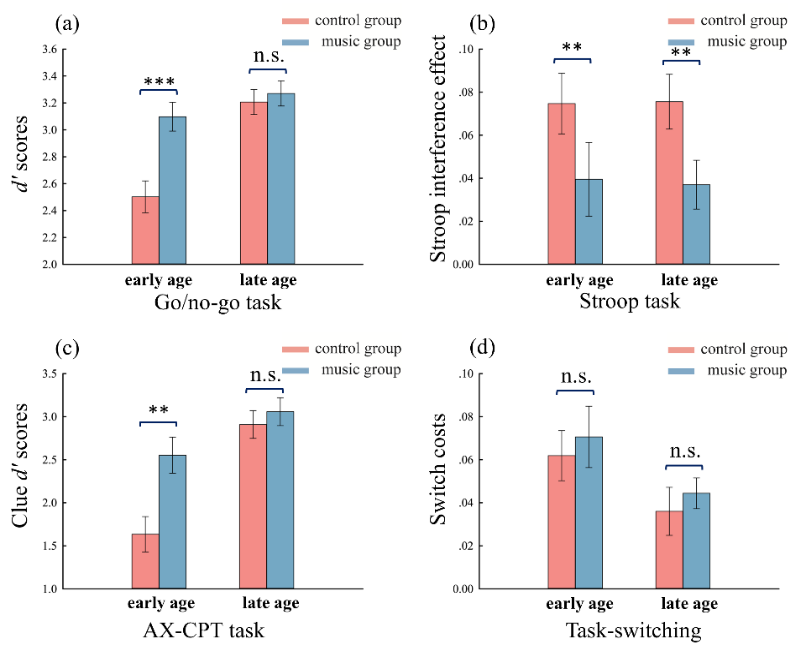 基于此,陈杰副教授及合作者采用行为及脑电技术围绕音乐训练与执行功能的关系开展了系统实验研究。首先通过两个行为学实验对比了接受和未接受过专业音乐训练的儿童(7-13岁)在执行功能三个子成分上的发展特点。结果显示:音乐训练组儿童在抑制控制(Go/no-go和Stroop)和工作记忆(AX-CPT)任务上的表现要显著好于控制组儿童,但是在认知灵活性(Task-switching)任务上两组儿童没有显著差异。这表明音乐训练与儿童抑制控制和工作记忆的提升具有显著的关联。更为有趣的是:7岁之前学习音乐比7岁之后学习音乐会产生更广泛的训练迁移效应(如图2),首次发现了音乐训练对儿童执行功能的影响存在敏感期,进一步为早期音乐教育的重要性提供了科学证据。该研究将于近期发表在音乐心理学领域国际主流期刊《Psychology of Music》上。陈杰副教授为该论文的通讯作者,其研究生陈洁佳同学为论文的第一作者,英国阿伯丁大学心理开元平台(中国)科技公司Meike Scheller博士、我校音乐开元平台(中国)科技公司胡碧瑜老师、教科院彭荣老师、武川煜、刘翠红、刘思永同学为本研究的共同作者。