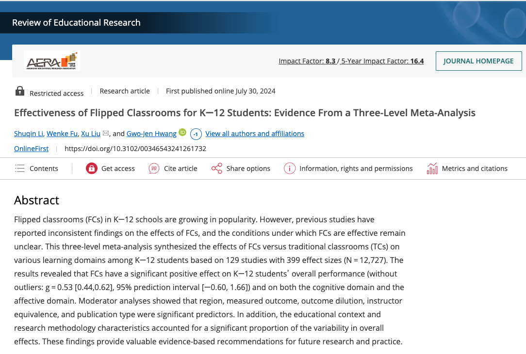 近日,我院刘旭教授研究团队取得重要学术成果。其论文“Effectiveness of flipped classrooms for K-12 students: Evidence from a three-level meta-analysis”在教育学国际顶级期刊《Review of Educational Research》发表。2021级课程与教学论专业博士生李书琴为第1作者,2021级课程与教学论专业硕士生符文可为第2作者,台中教育大学黄国祯教授为第3作者,刘旭教授担任本论文的通讯作者。湖南师范大学为该论文的第一作者单位及通讯单位。