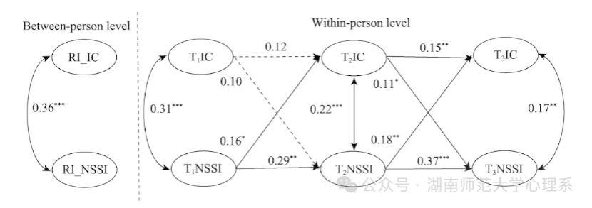 从二者的高发时间和性质特点来看,同一性混乱与青少年自伤行为可能具有循环作用关系。因此,本研究对1258名中学生进行为期一年的三波段追踪调查,通过随机截距交叉滞后模型(RI-CLPM),揭示了同一性混乱与自伤行为的动态双向作用机制,并探查了疏离感的中介作用。