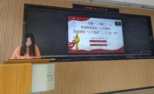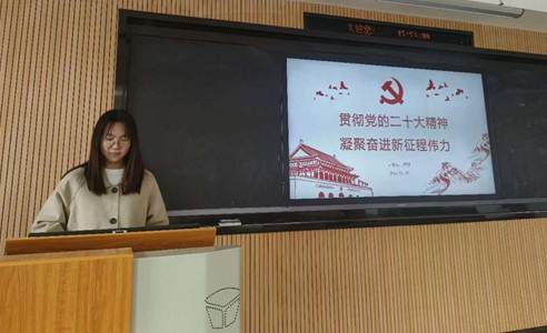 王雨苹同志以“学习党的二十大精神必须着重把握的十项内容”为主题进行微党课学习分享,从“着重把握过去五年的工作和新时代十年的伟大变革”开始,谈到“以中国式现代化全面推进中华民族伟大复兴”,最后以“党的自我革命的重要性”延伸到作为新时代的大学生要不断进行自我革命、自我提高,坚持初心和使命。王雨苹同志认为,我们学习领会党的二十大精神,必须坚持全面准确、突出重点,既要原原本本学、又要深入理解。