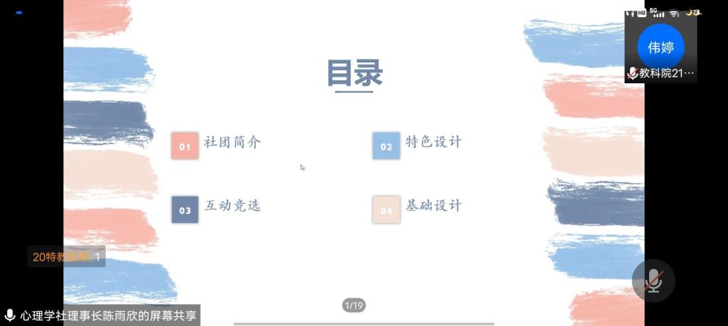 在此次会议中,陈雨欣对心理学社进行了简单的介绍,并对心理学社的内外形象展开了相关叙述。其中,内部形象包括社旗、社徽、宗旨、社诗、社服、社歌和吉祥物。外部形象包括格塘支教、南音心房、阳光之旅和其他特色活动。有奖问答和理事介绍环节后,心理学社以线上投票的方式竞选监事。会议最后,监事长李森斓为会员讲解思想建设和组织建设相关问题。思想建设方面包括支部学习方案、团日活动方案等,组织建设方面分为心理学社会员考核条例、奖惩制度细则等。