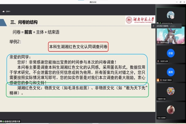 杨春明以“研究中的问卷设计”为主题,围绕“问卷的基本了解”“问卷的设计及其原则”“SPSS在问卷试测中的应用”三个方面分别展开论述。并且结合自身设计问卷时的思维结构与实操经验,向大家分享问卷设计在确定研究主题、拟定问卷结构、确定问卷类型、设计具体问题、选择问卷发放工具、问卷试测等方面的注意事项与技巧方法,以及完善问卷、正式发放问卷的切实路径。他提出,在问卷完善与正式发放环节,要注意对回收上来的数据进行筛选和剔除,注重提高后期统计分析的有效性和准确性。在讲堂的自由提问环节,杨春明耐心解答同学们提出的疑问,并积极鼓励同学们进行数据统计的尝试。