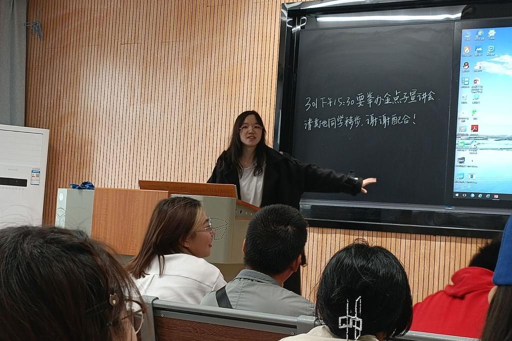 宣讲会伊始,杨宇霏通过引入关于举办我校第十一届“金点子”大学生创意大赛的通知,详细介绍了“金点子”创意大赛的参赛方式、参赛内容、报名评选流程与评审标准。同时,杨宇霏展示了她曾参与的“金点子”大学生创意大赛的作品,并分享了她参加大赛与创作作品时的经验。她提出,创意来自于生活,许多优秀的“金点子”参赛作品灵感来源于日常生活,并以食堂倒饭的巧妙设计的具体事例来进行说明。会议结束之际,杨宇霏解答了部分新生提出的有关“金点子”大赛的问题,并与部分同学进行了一对一交流。