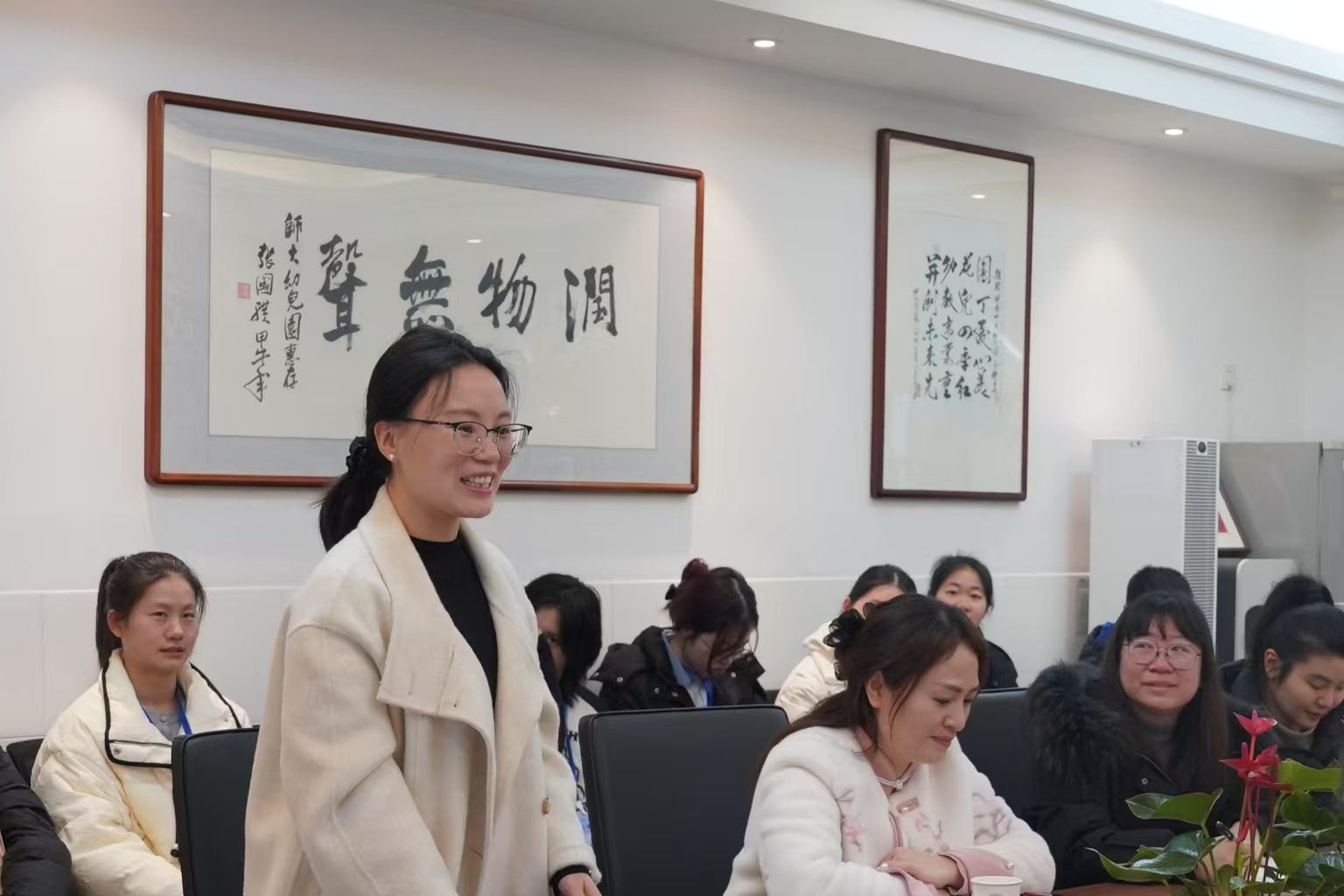会议由师大幼儿园教学部主任曹怡主持,她组织同学们观看了师大幼儿园宣传片,帮助同学们全方位了解师大幼儿园的办园历史和办学特色。师大幼儿园党支部书记兼园长徐惠代表幼儿园对同学们的到来表示热烈欢迎,并对实习工作进行了整体部署和安排,希望同学们在实习工作中实现理论到实践的跨越。师大幼儿园后勤副园长易乐媛从活动组织安全,生活环境安全以及个人行为规范三个方面对实习工作提出了细致要求。师大幼儿园教学副园长周艳根据实习计划对每周的任务安排进行了详细介绍,要求同学们严格遵守“师德师风”“以身作则”“安全第一”“积极学习与反思”“实习考核”等五个方面的要求。随后,实习生和各班班主任兼园内指导教师分别进行自我介绍和结对,实习生纷纷表示会主动学习、虚心求教,园内指导教师则都对实习生的到来表示欢迎。最后,湖南师范大学教科院杨希老师和彭荣老师分别寄语实习生,希望同学们一方面保持学习者的状态,另一方面要尽快实现从学生到教师的身份转变,做到“眼睛亮、手脚勤、内心暖”,珍惜宝贵的实习机会,实现专业成长。
