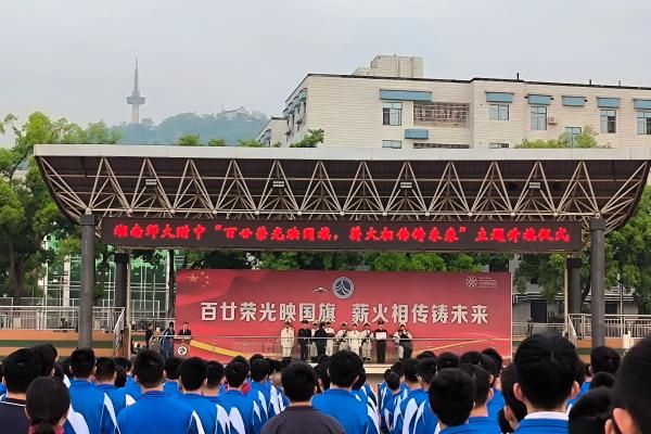 国旗护卫队学生统一着装,持金属护旗杆完成升旗流程。全体师生按指定区域列队站立,先后奏唱《义勇军进行曲》和《湖南师范大学附属中学校歌》。黄月初在国旗下发表讲话,介绍学校120年办学历史及国旗的特殊意义。他提到,这面国旗不仅承载着国家记忆,也象征着学校百廿年的教育传承。谢永红向国旗护卫队颁发荣誉证书。现场全体师生及实习队员手持小红旗,合唱《歌唱祖国》。