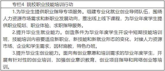 实施青年专项技能培训计划。以高校和职业院校毕业年度毕业生和其他青年群体为培训对象,以提升就业创业能力为核心,开展青年职业技能培训,增强青年群体适应产业发展、岗位需求和基层就业的能力。实施青年学徒培养计划,通过企校双师带徒、工学交替,培养适合企业发展和岗位需要的高技能人才。对城乡未继续升学的初高中毕业生开展劳动预备制培训。大力开展青年创业培训、新职业培训、技能提升培训。