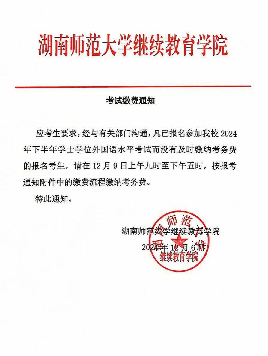 2024年下半年湖南师范大学高等学历继续教育和高等教育自学考试本科生学士学位外国语水平考试报考通知