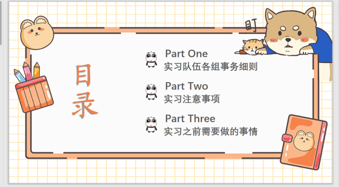 本次简报将从实习准备,实习队伍见习阶段进展、实习点的融入状况、实习阶段遇到的问题以及精神面貌五个方面的内容来展开介绍。