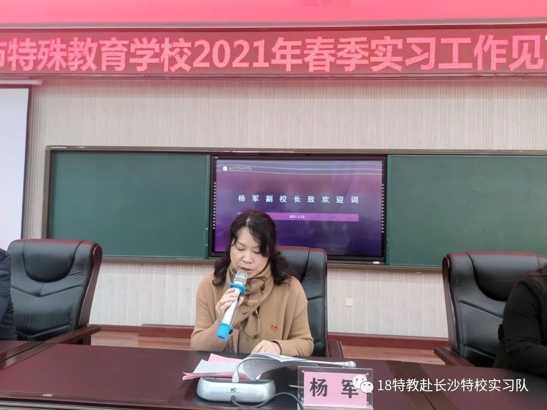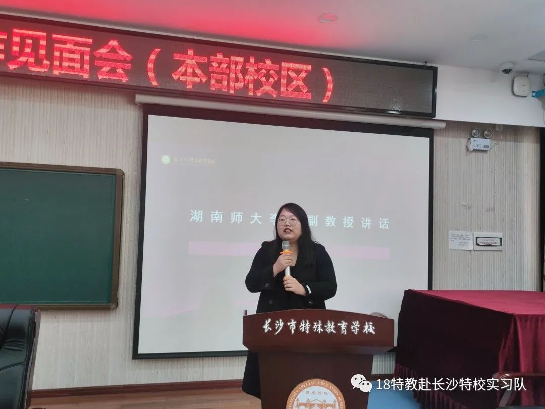 在教务处何礼主任的主持下,本次见面会拉开帷幕。何主任简单介绍了与会人员:长沙市特殊教育学校杨军副校长、中层干部、教学专干及带教师傅,和湖南师范大学李丹副教授、孔令新博士、钟雪博士以及教育科学开元平台(中国)科技公司特殊教育系实习生等。